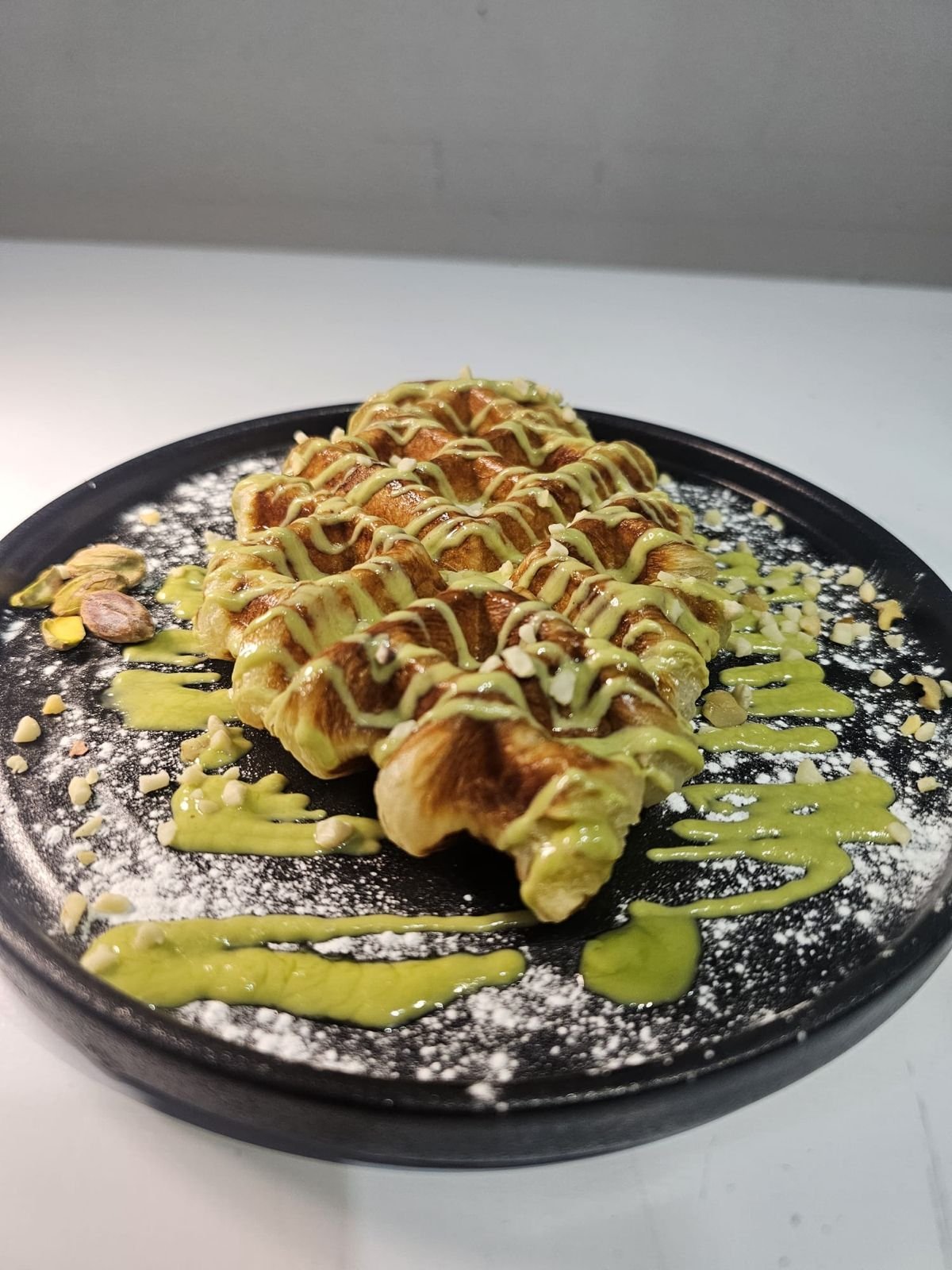 Freshly made waffle served with your favourite kinder bueno chocolate covered with milk and white chocolate sauce and a scoop of amazing vanilla ice cream.